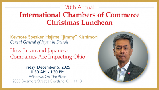 The British-American Chamber of Commerce cordially invites everyone from Ohio's community of local and international business professionals, civic leaders, and government representatives to join us at Windows on the River on December 5th for the Annual International Chambers Christmas Luncheon. We are honored to have Hajime "Jimmy" Kishimori, Consul General of Japan in Detroit, as our keynote speaker.